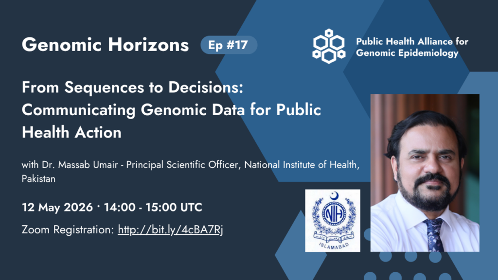 Join us for Episode 17 of the PHA4GE Genomic Horizons Webinar Series featuring Dr. Massab Umair from NIH Pakistan. This webinar will explore how genomic data can be communicated effectively to inform public health decision-making.